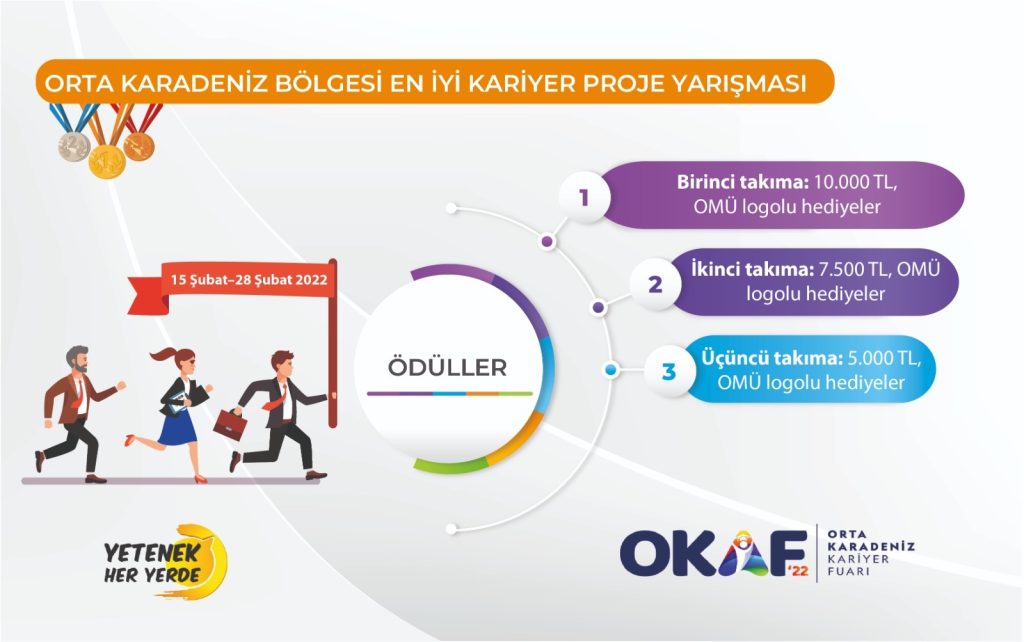 2-3 Mart tarihlerinde Cumhurbaşkanlığı İnsan Kaynakları Ofisi koordinasyonu ve Ondokuz Mayıs Üniversitesi işbirliği ile gençlerimizin yeteneklerini göstermelerini, proje yazma ve grup çalışması becerilerini artırmalarını desteklemek amacıyla Orta Karadeniz Kariyer Fuarı (OKAF) kapsamında “ En İyi Kariyer Proje Yarışması” düzenlenecektir.